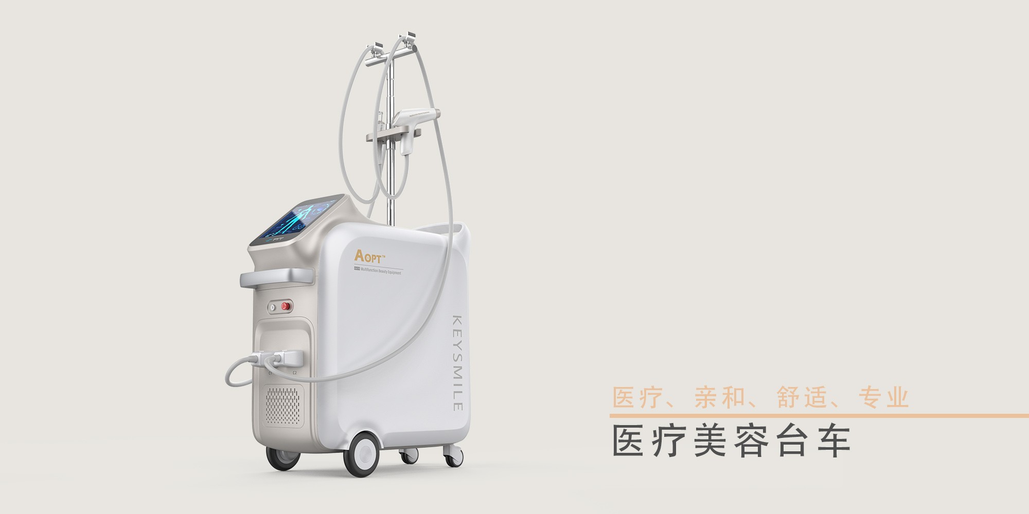 這款光子嫩膚美容臺(tái)車的設(shè)計(jì)簡(jiǎn)約、時(shí)尚,運(yùn)用柔和的曲線條打造產(chǎn)品的親切感和舒適感。簡(jiǎn)潔的白色搭配素雅的香檳色凸顯產(chǎn)品干凈特點(diǎn),打造產(chǎn)品的輕奢氛圍。機(jī)身比例合適,方便移動(dòng),手柄小巧精致,能夠給操作者帶來舒適的握持感。